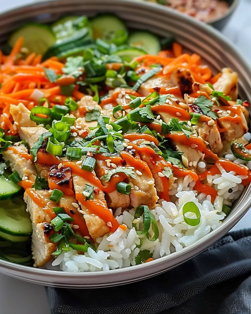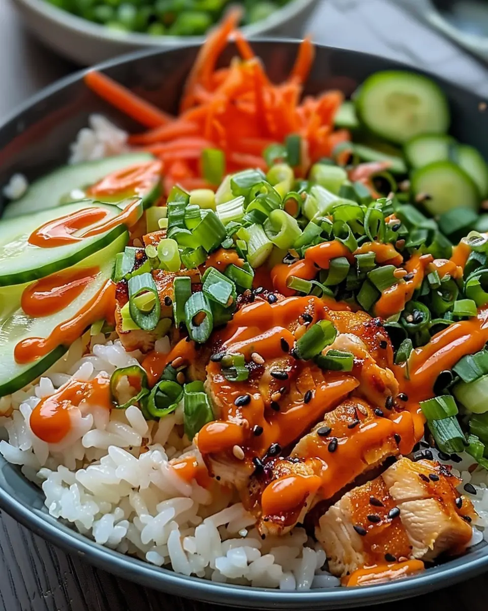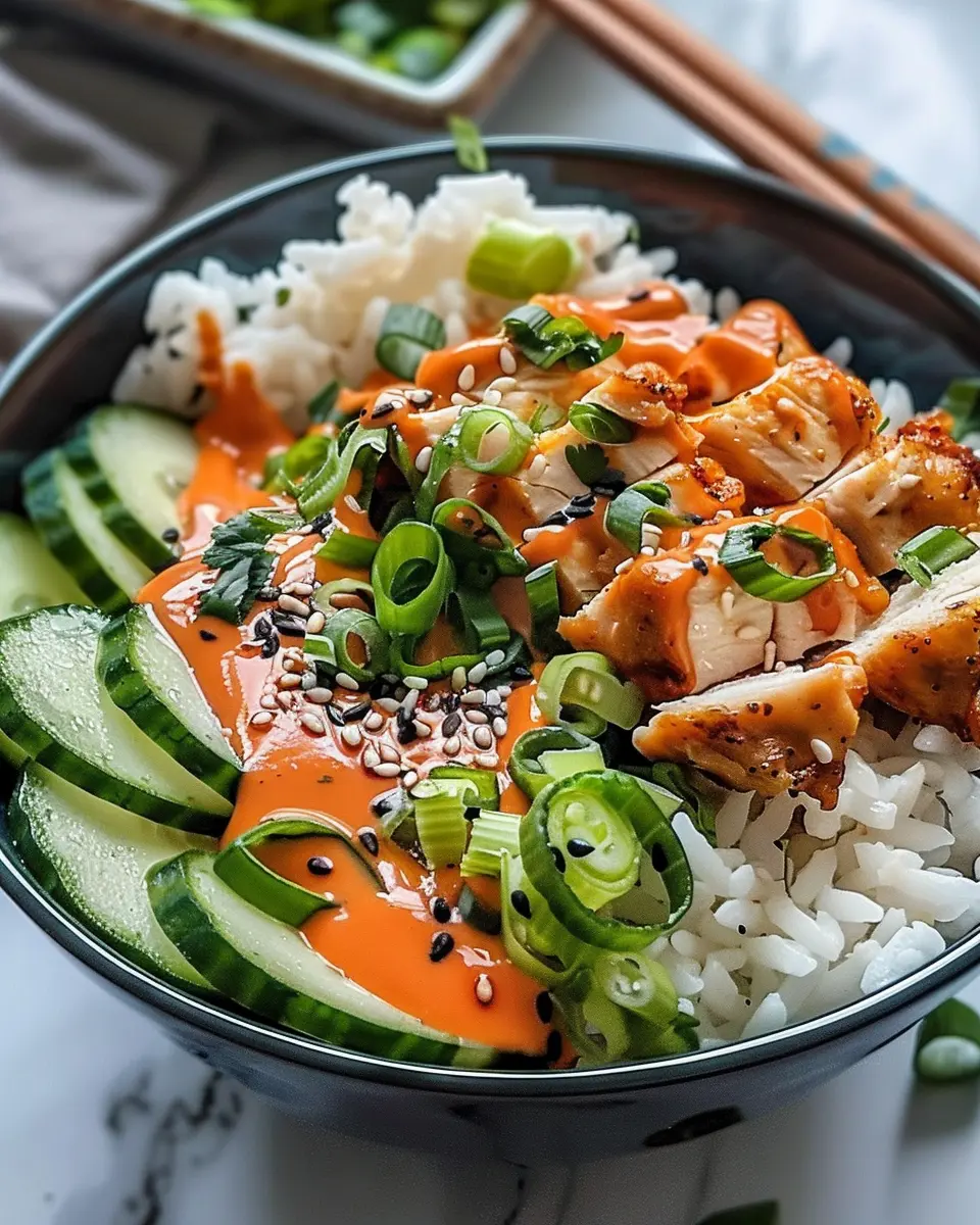 - In a bowl, layer the rice, followed by the chicken mixture, then top with cucumbers, carrots, and green onions.