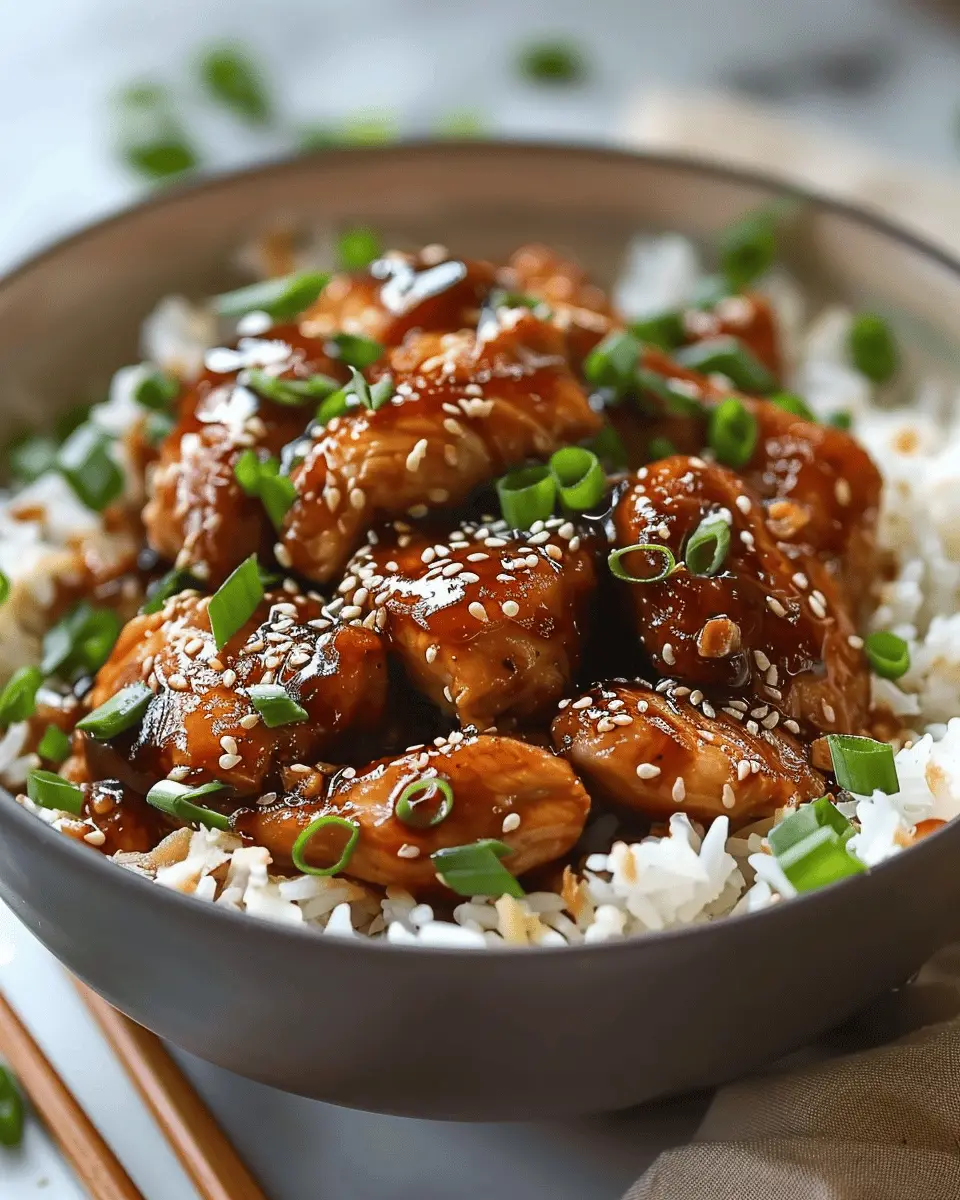 Finally, it’s time to assemble your dish! Fluff some cooked rice in a bowl or plate, then place the Caramelised Soy Chicken on top.