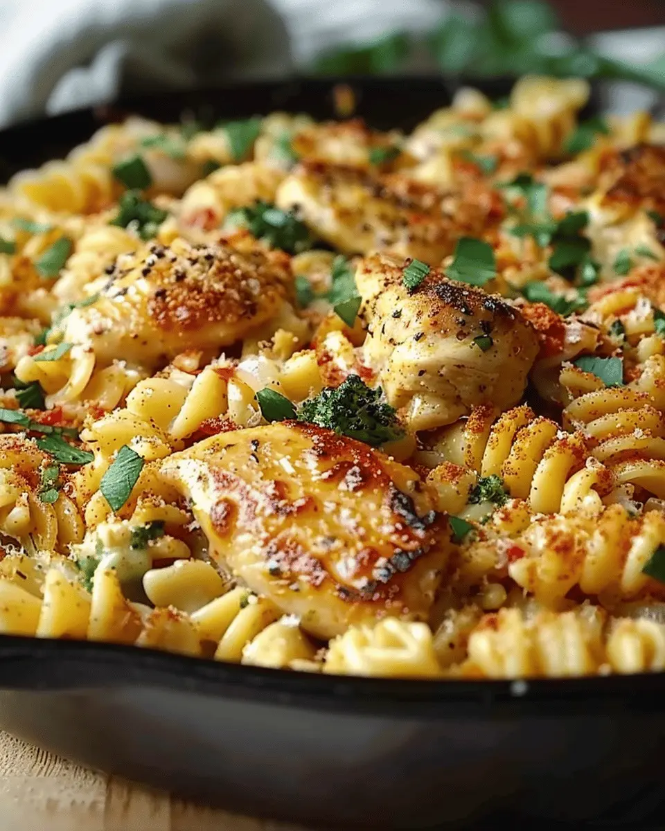 PrintCheesy Cajun Garlic Chicken Rotini: Easy Skillet Delight
