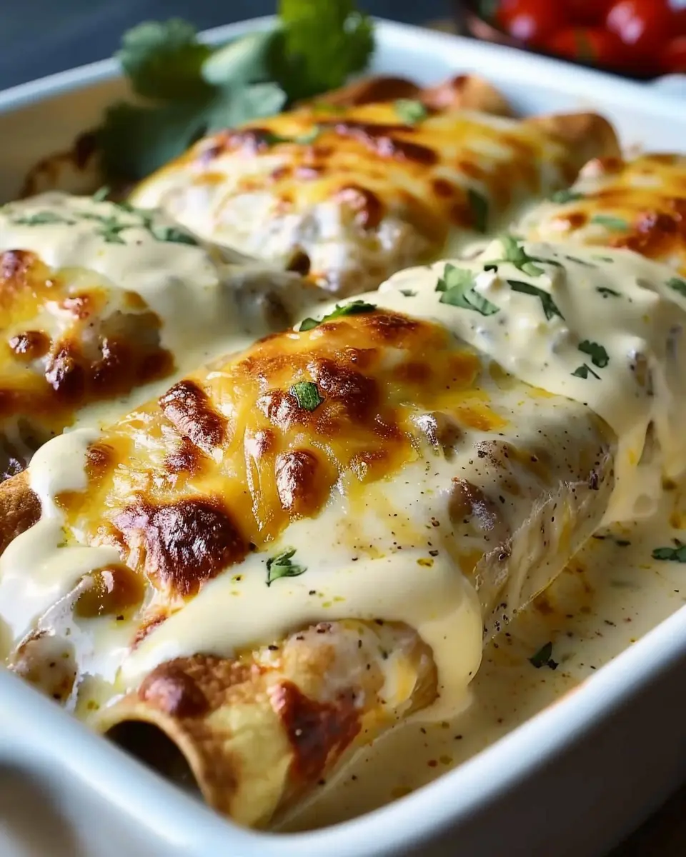Enjoy this simple and flavorful recipe for cheesy chicken enchiladas topped with a creamy sauce. Perfect for a weeknight dinner!