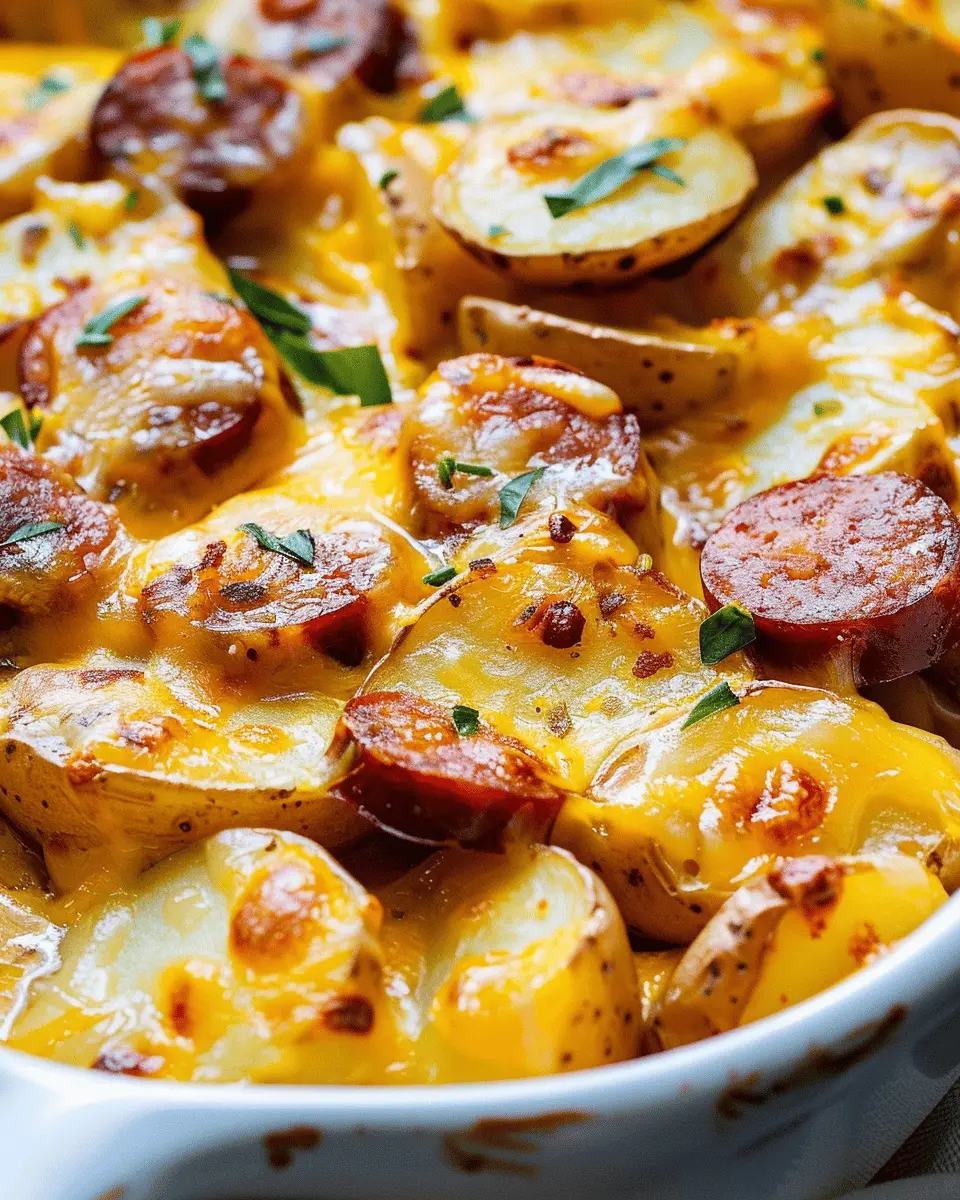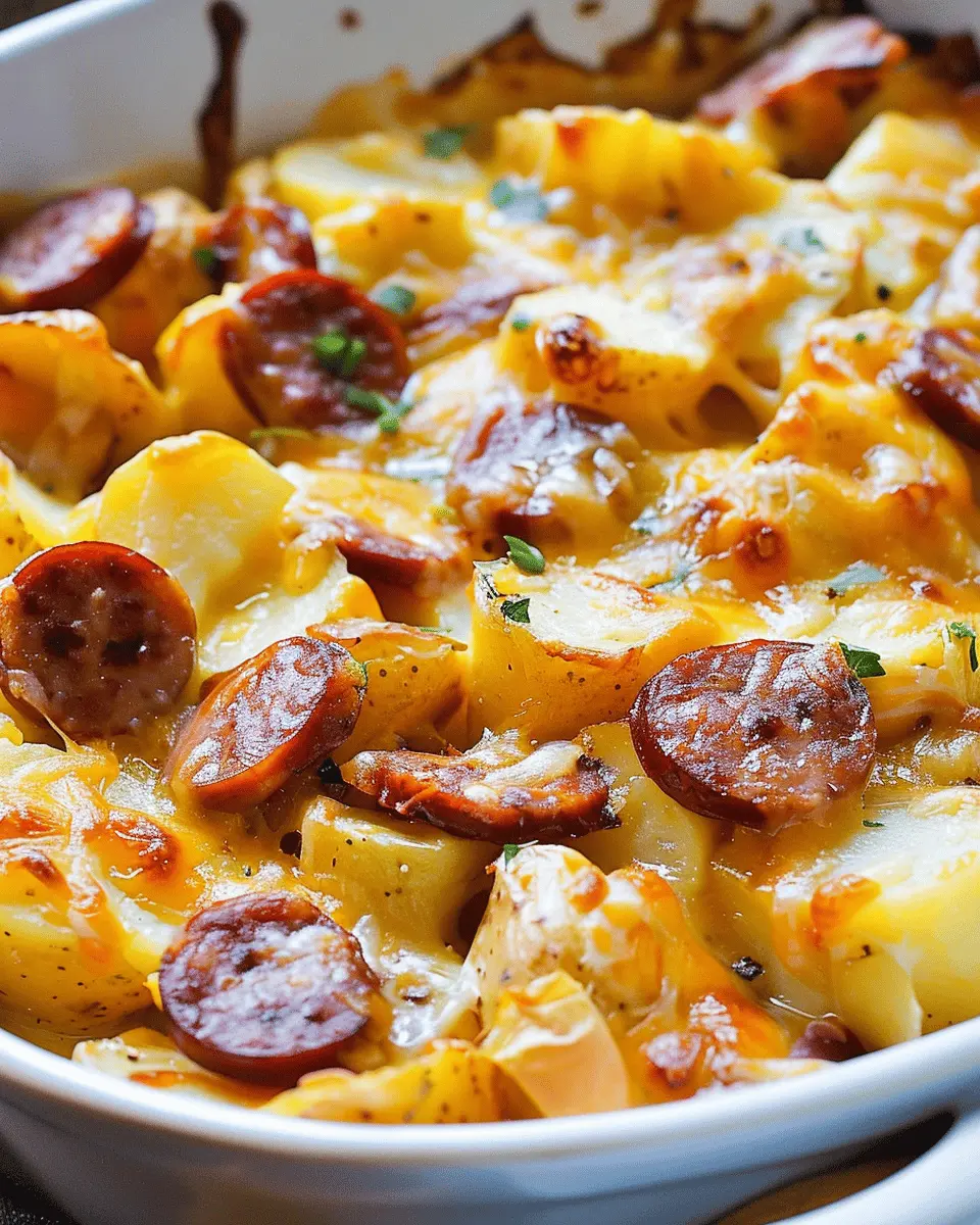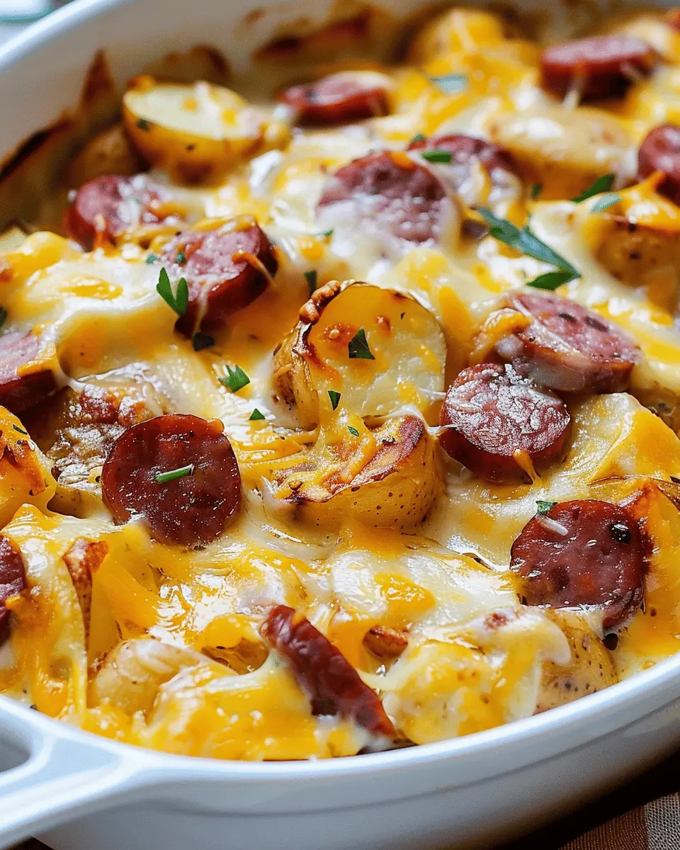 A deliciously cheesy and comforting dish combining potatoes and smoked sausage, perfect for a family meal.