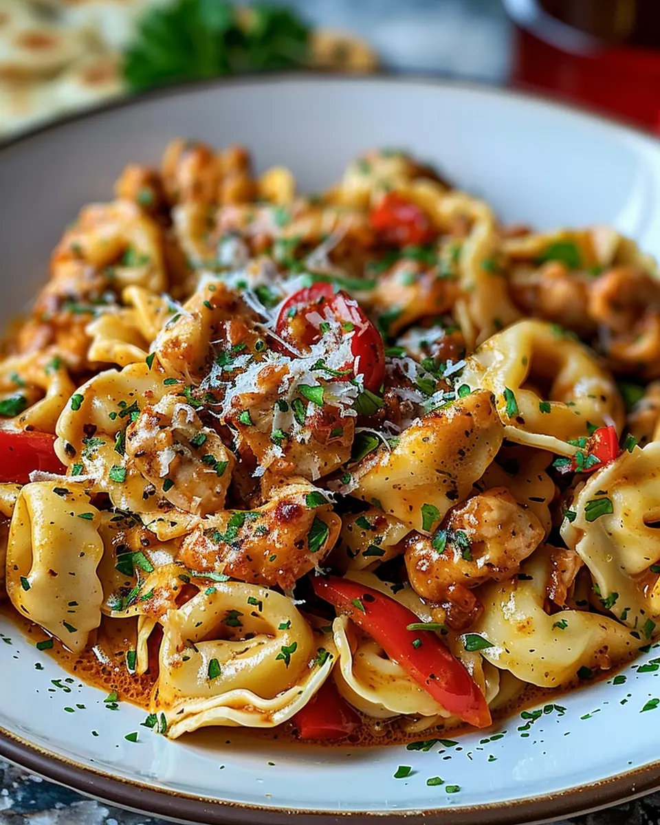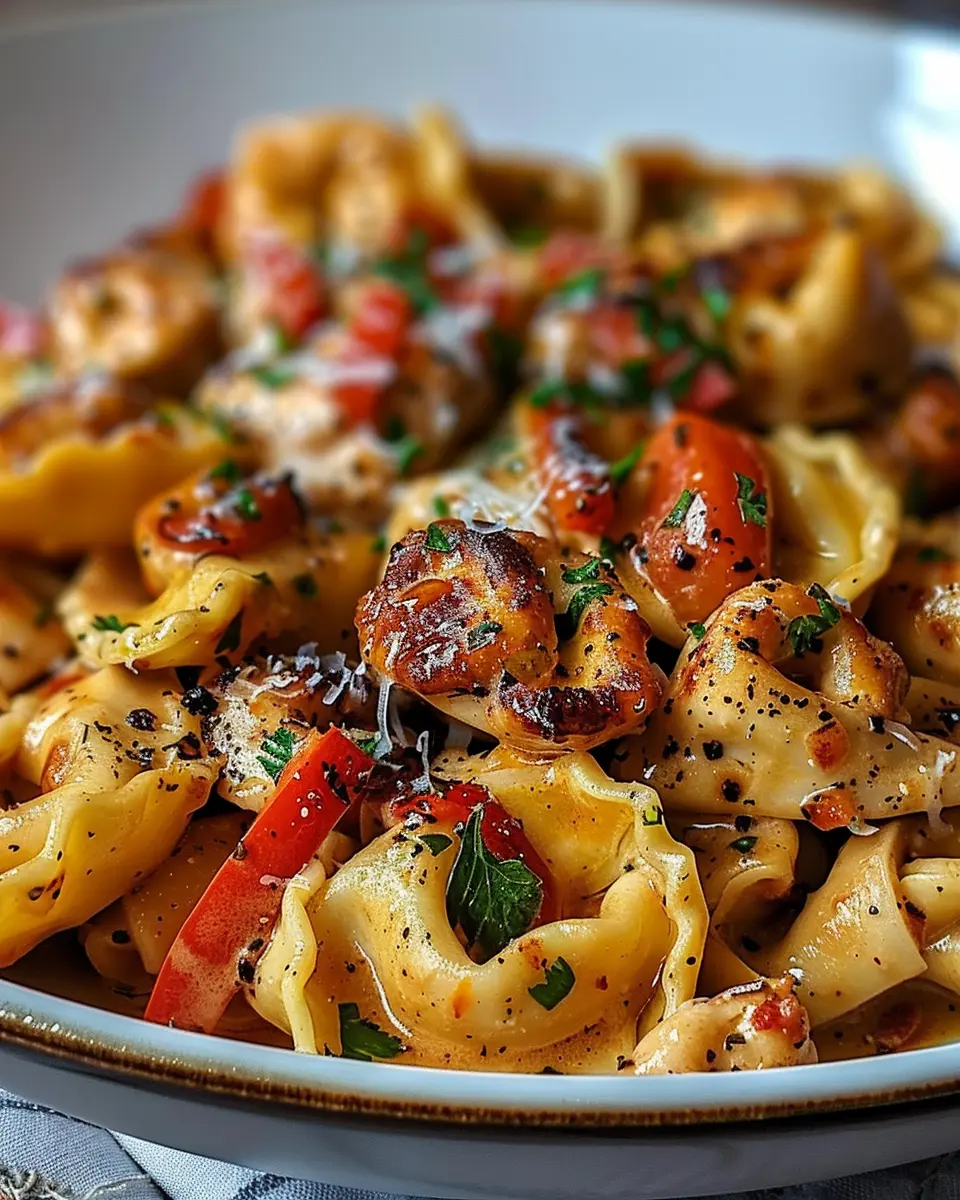 Cowboy Butter Garlic Chicken Tortellini with Fire-Roasted Red Peppers is a delightful and flavorful dish that combines tender chicken and pasta with vibrant peppers.