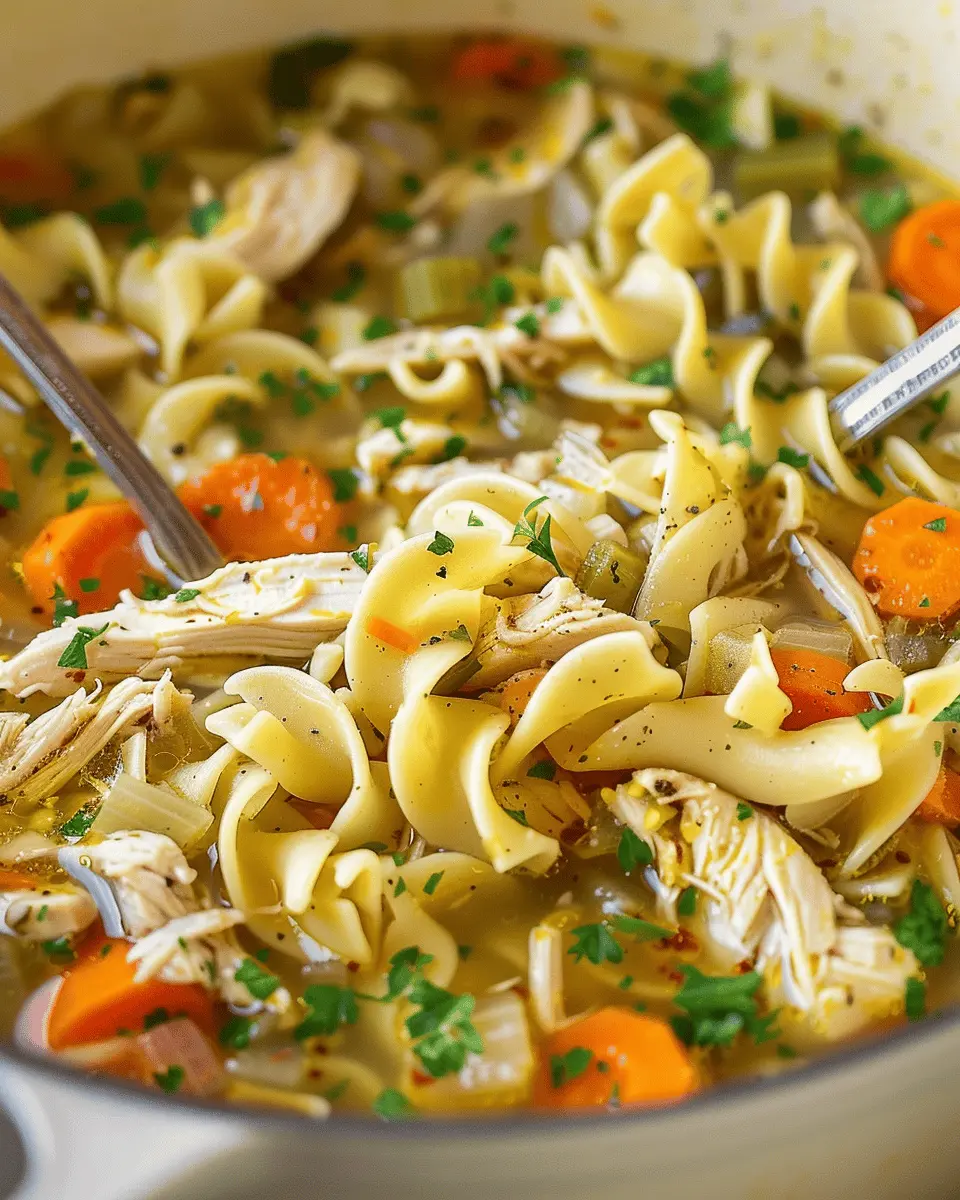 Once the noodles are cooked to your liking, it’s time to give your easy chicken noodle soup the final touch. Stir in the shredded chicken and let it simmer for another couple of minutes until everything is warmed through. For an added touch, sprinkle fresh parsley on top before serving to elevate both the flavor and presentation of the dish.