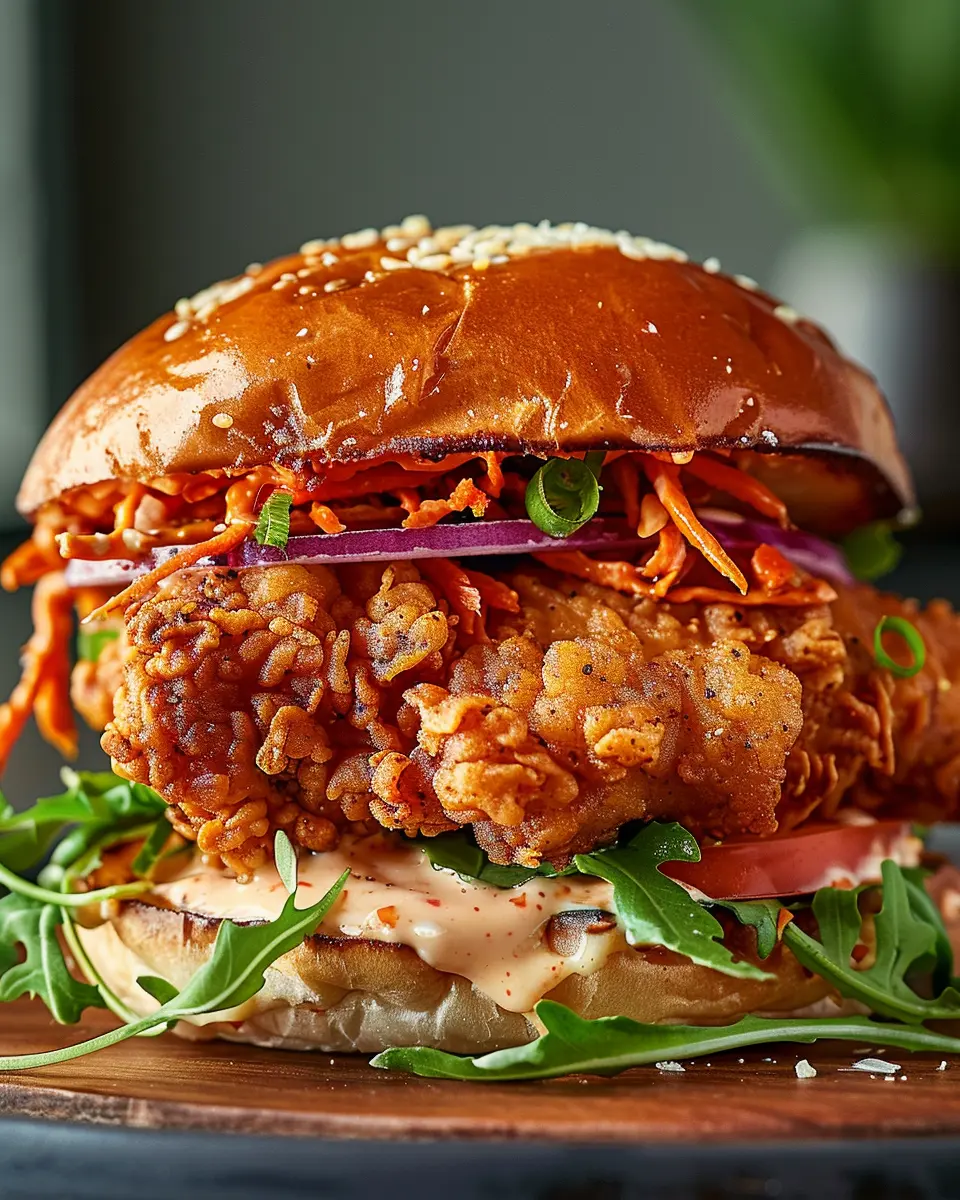 - Layering time: Place the crispy chicken on the bottom bun. Add a few slices of fresh cucumber and a handful of arugula for that added crunch and freshness.