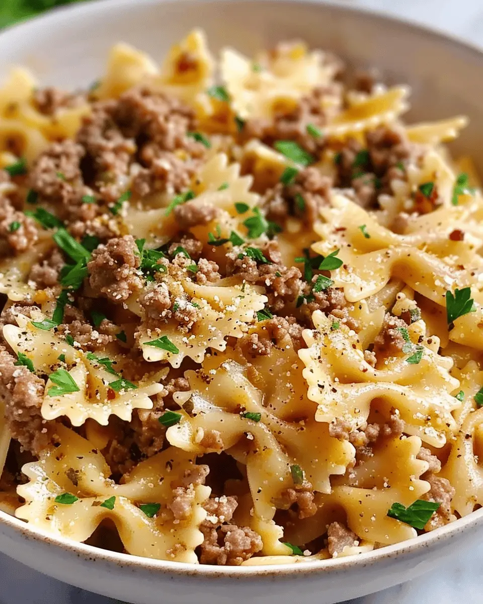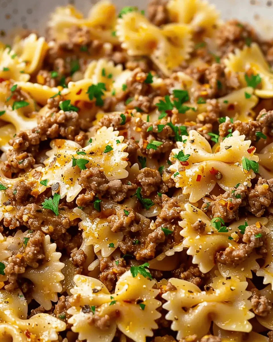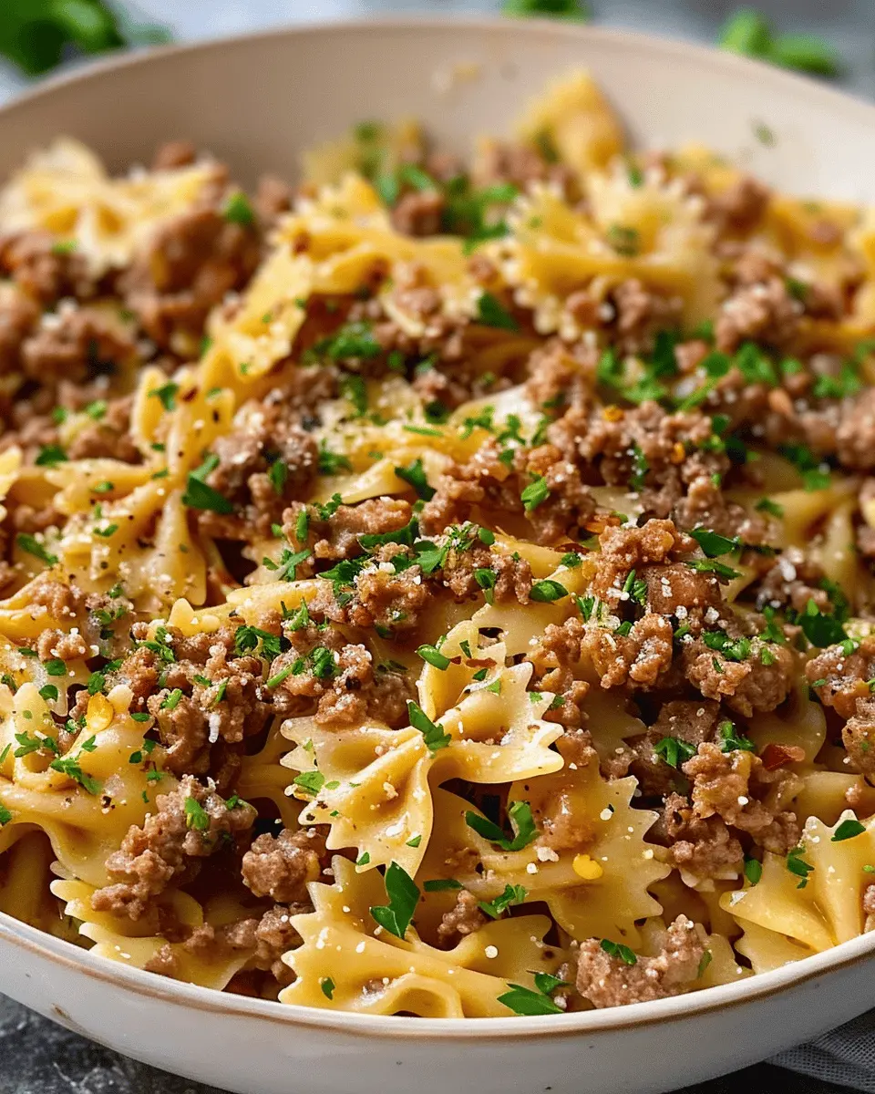 PrintGarlic Butter Bowtie Pasta with Ground Beef Recipe: Easy and Delicious