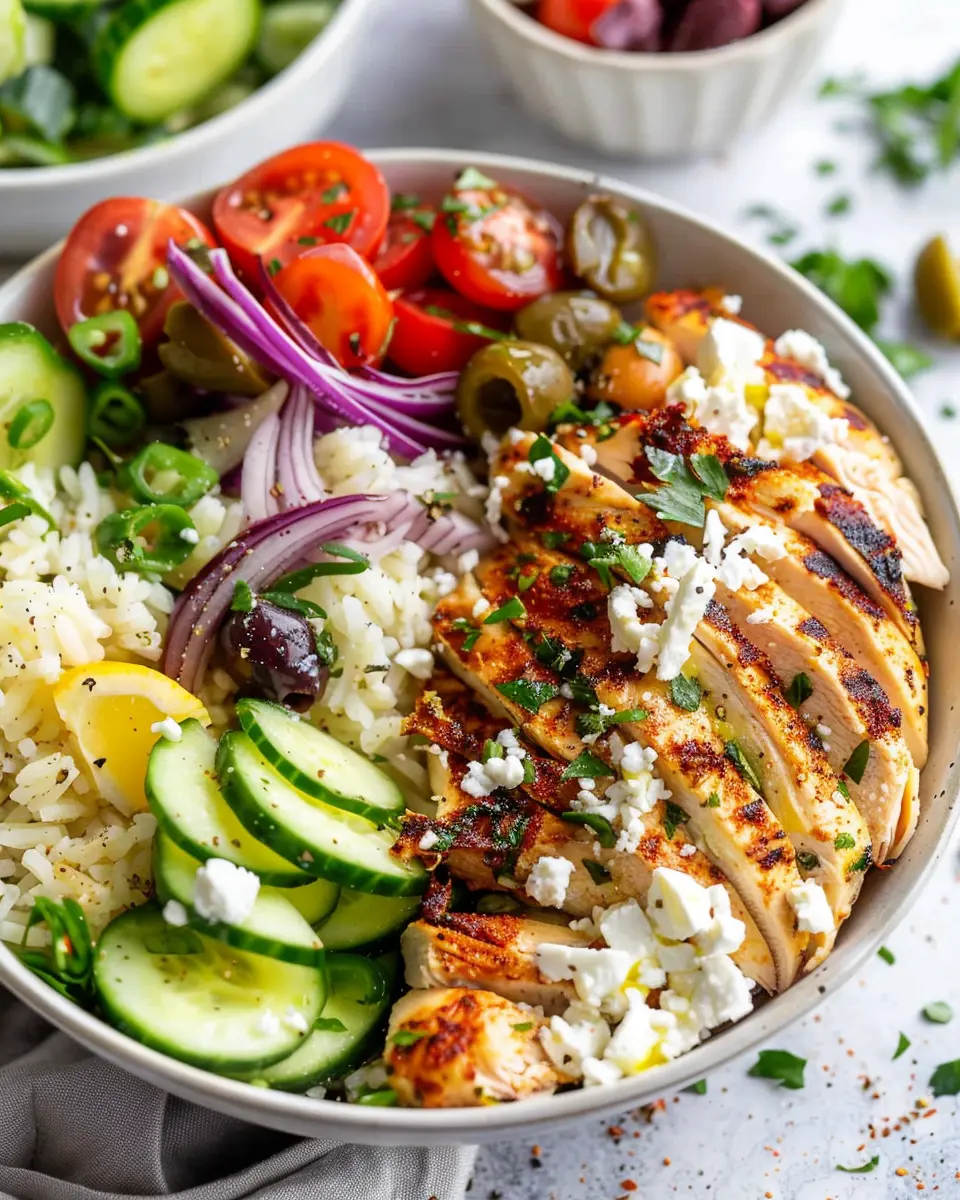 - In a bowl, layer the cooked rice, followed by the sliced chicken, cherry tomatoes, cucumber, red onion, olives, and feta cheese.
