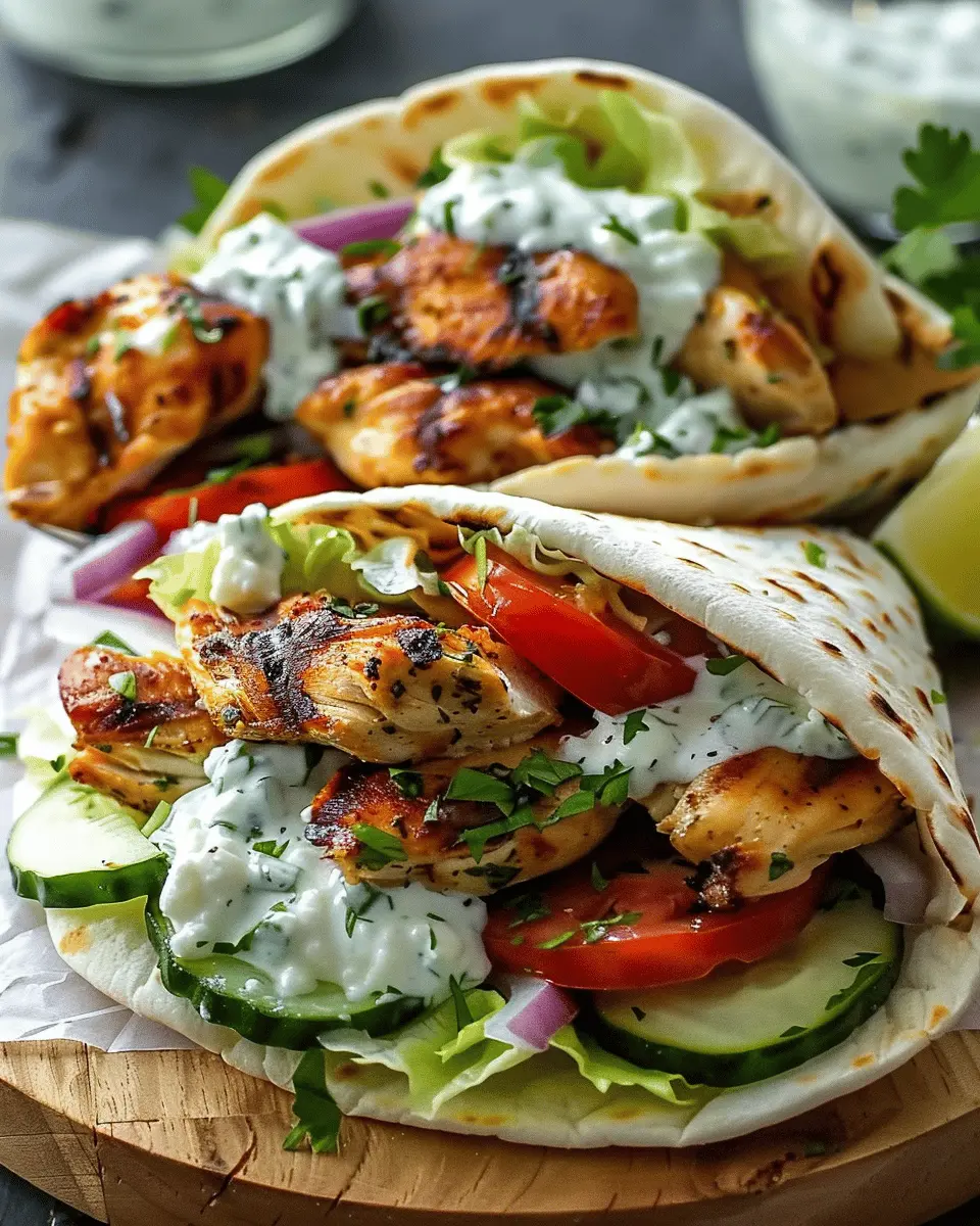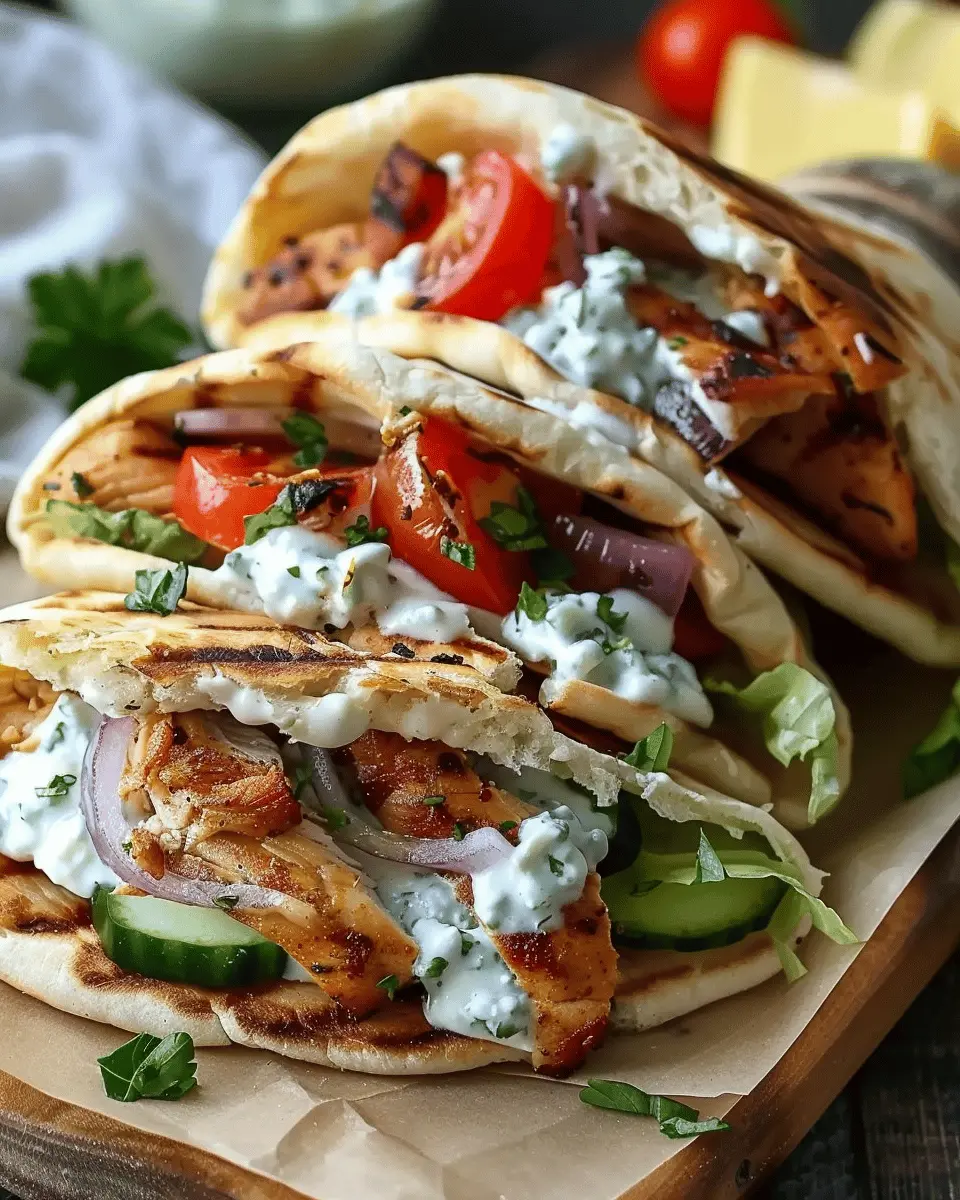 Now comes the fun part—assembling your Mediterranean Chicken Gyros! Take your warm pita bread and start layering. Place a generous serving of sliced chicken on the pita, followed by a dollop of your creamy feta tzatziki. Don’t forget to add fresh toppings like lettuce, tomatoes, and red onion for that delightful crunch!
