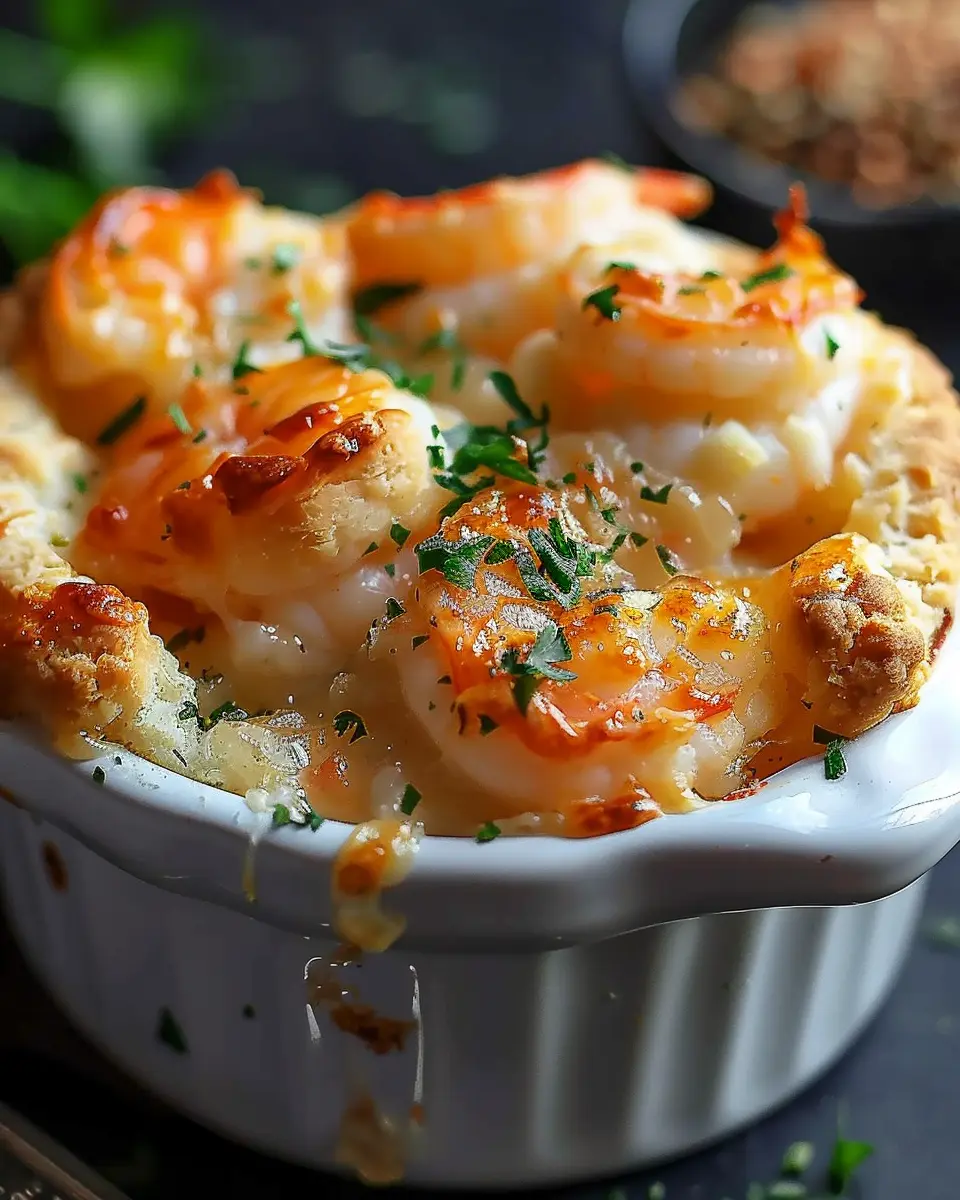 Indulge in the luxurious flavors of shrimp and lobster combined with a buttery Cheddar Bay biscuit topping in this delectable pot pie.