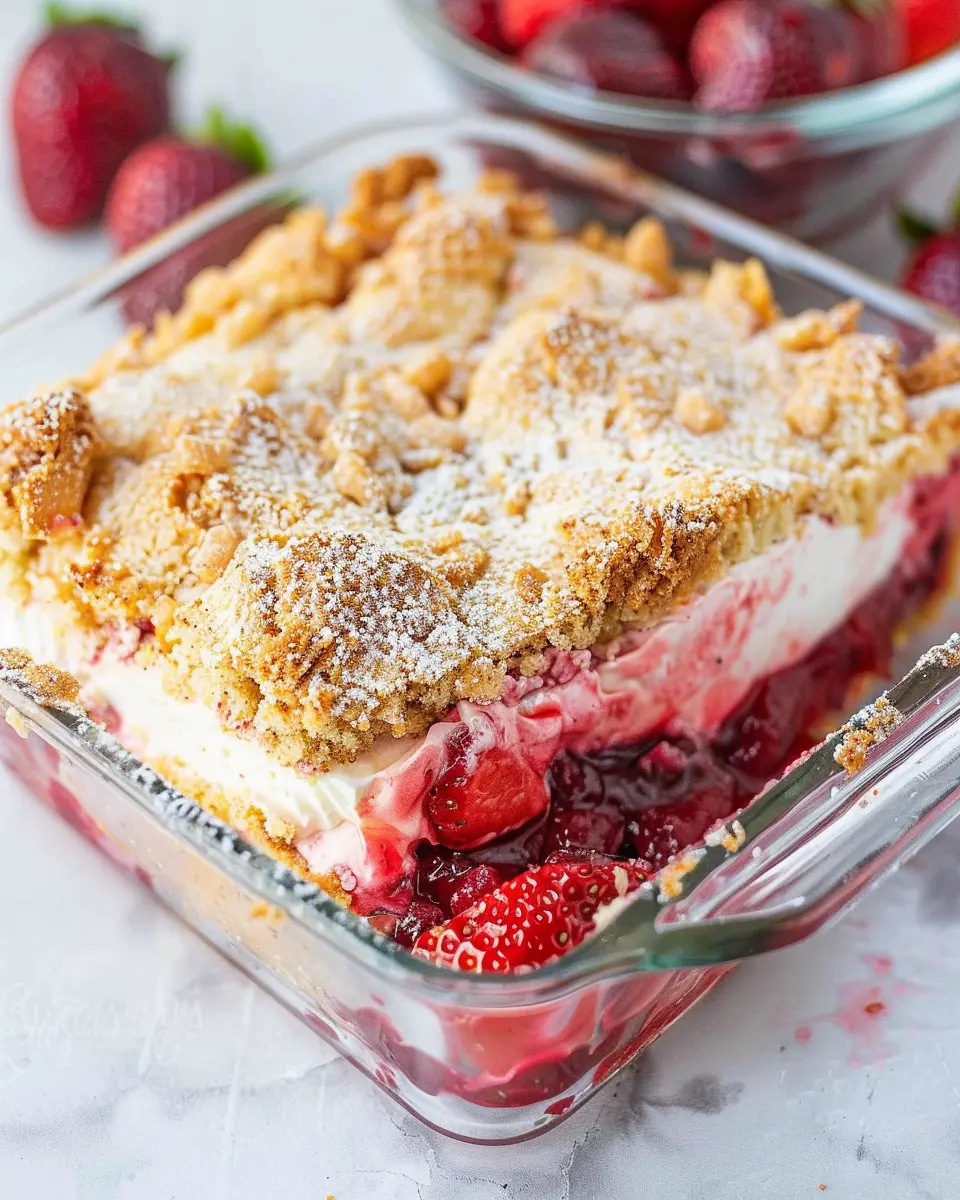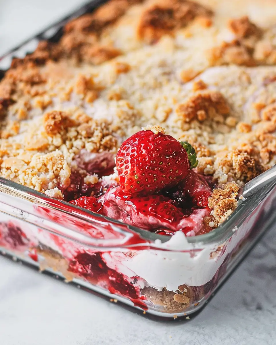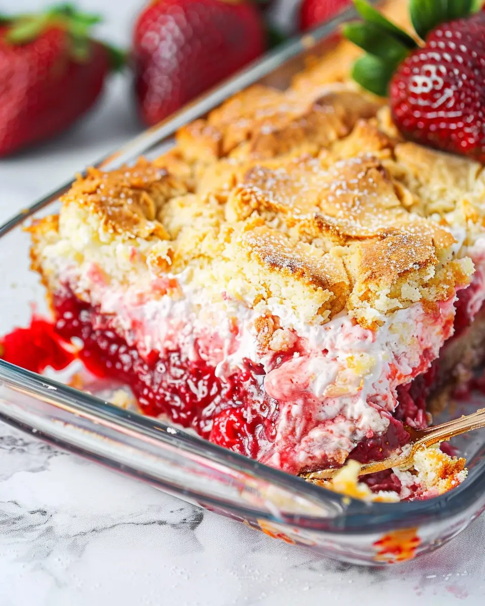 A delicious and easy dessert that combines the flavors of strawberry and cheesecake in a simple dump cake.