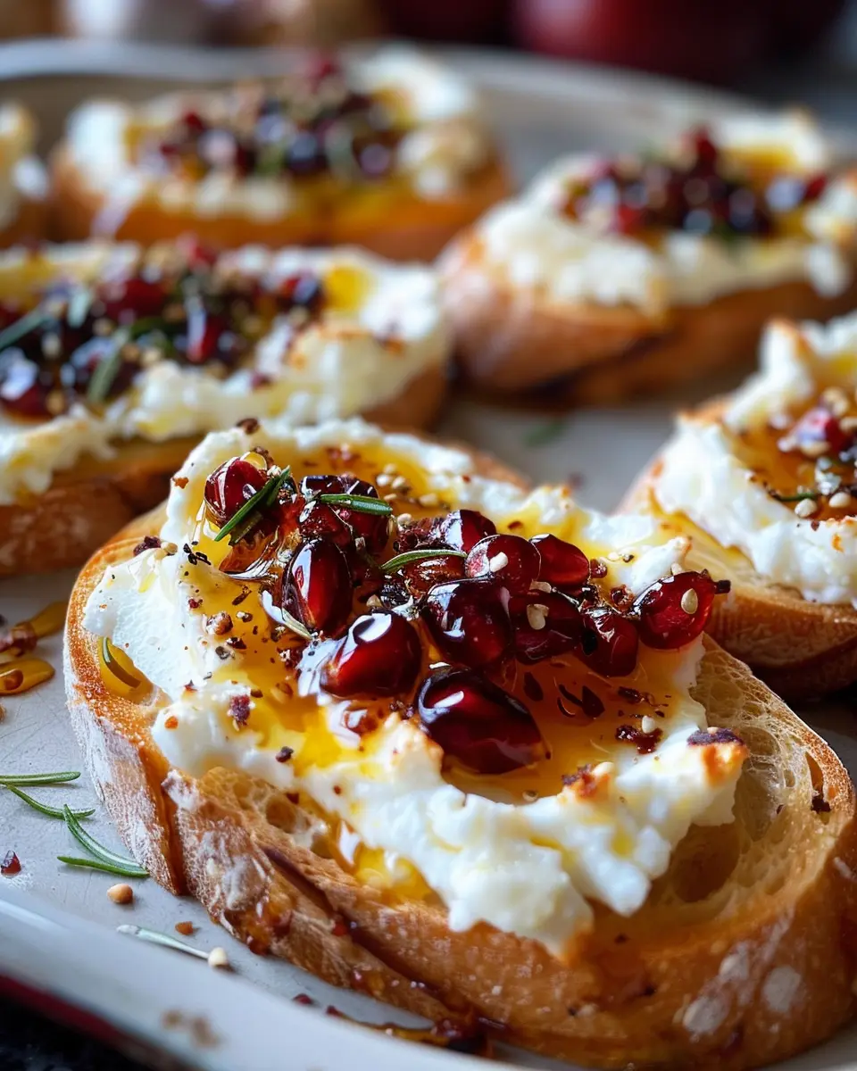 Crispy crostini serve as the ideal canvas for your sweet and spicy whipped feta crostini.