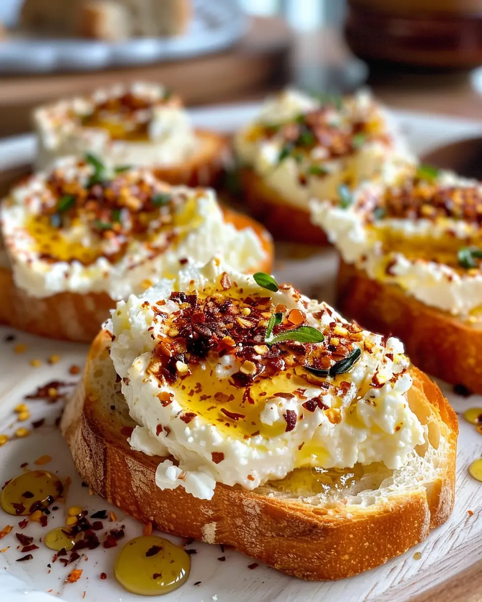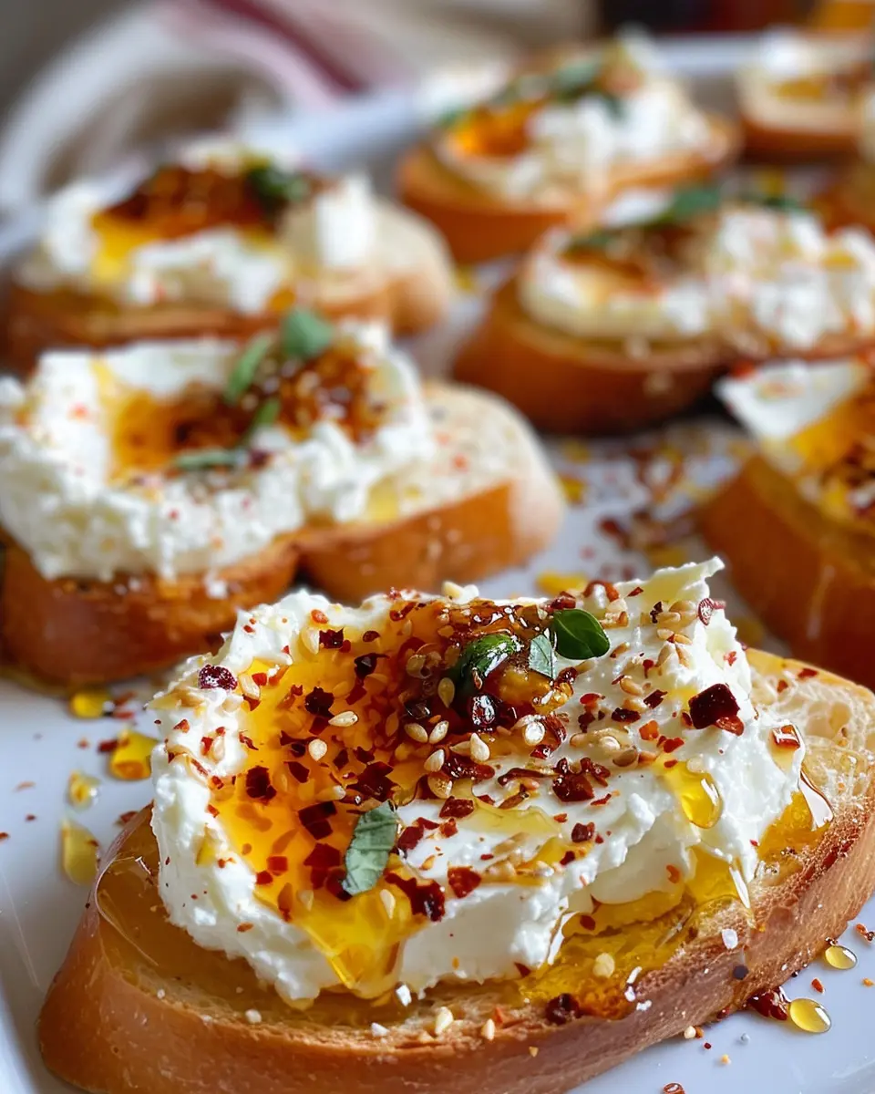 PrintSweet and Spicy Whipped Feta Crostini with Hot Honey Delight