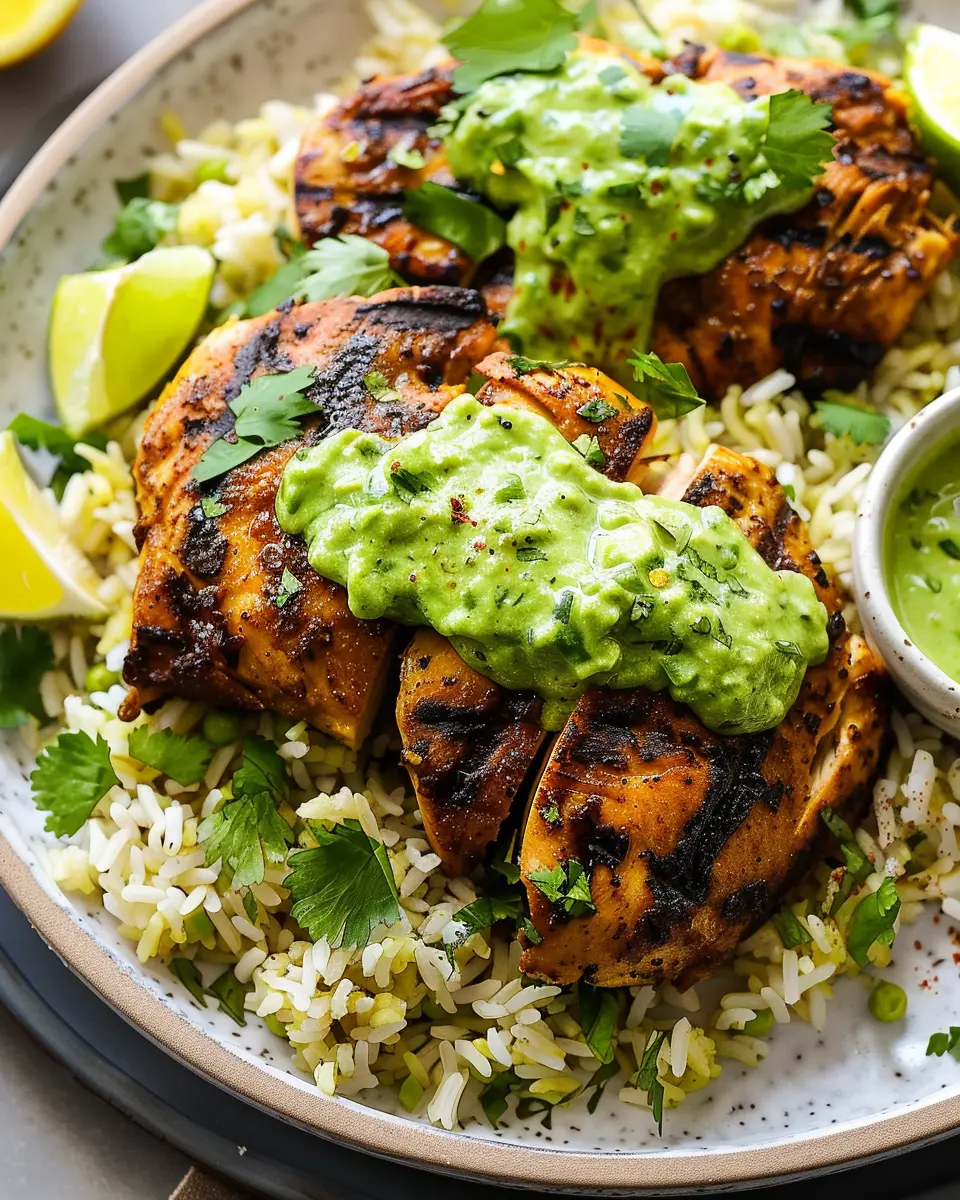This dish combines succulent chicken with flavorful rice and a vibrant green sauce, making it a must-try for anyone who loves rich, bold flavors.